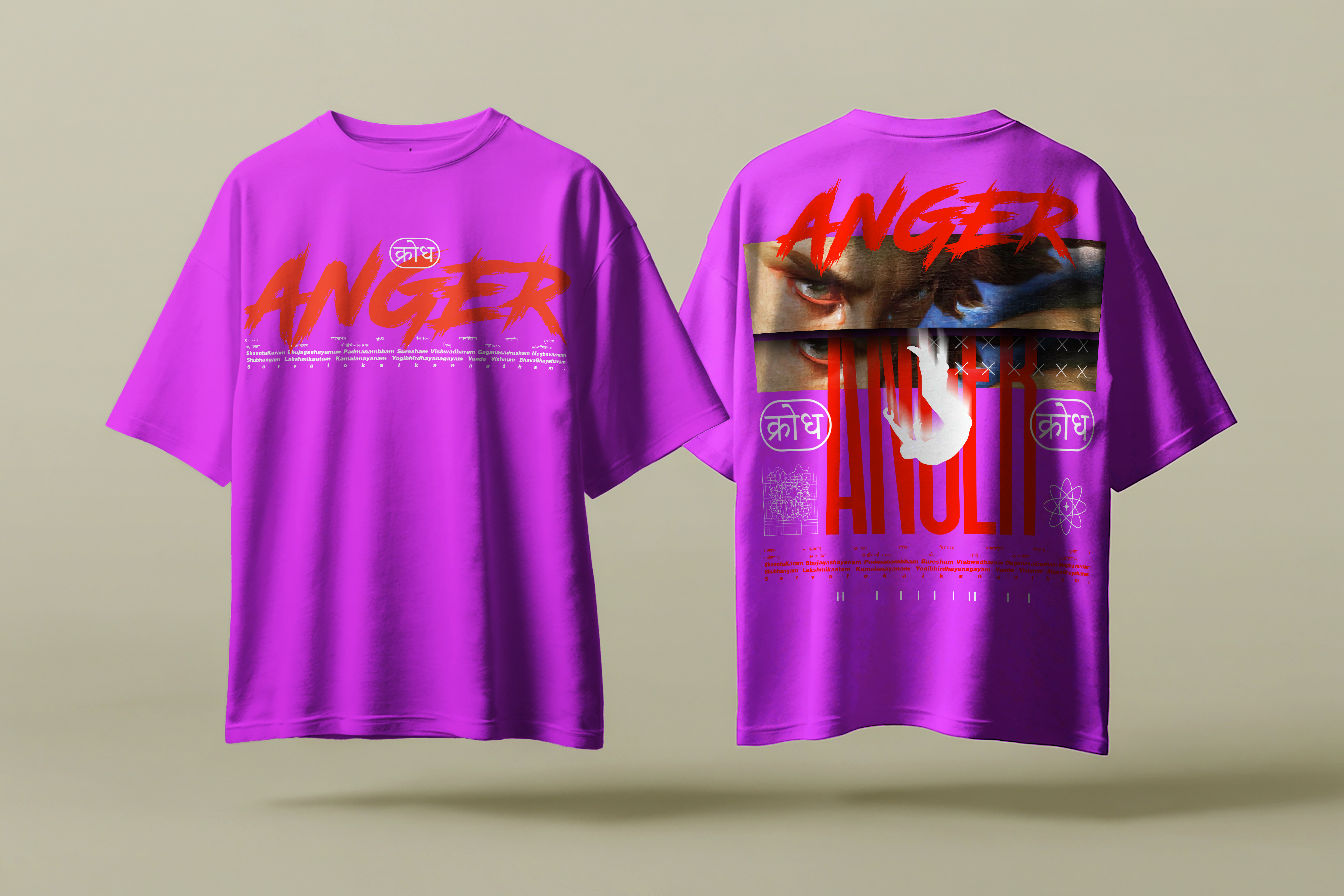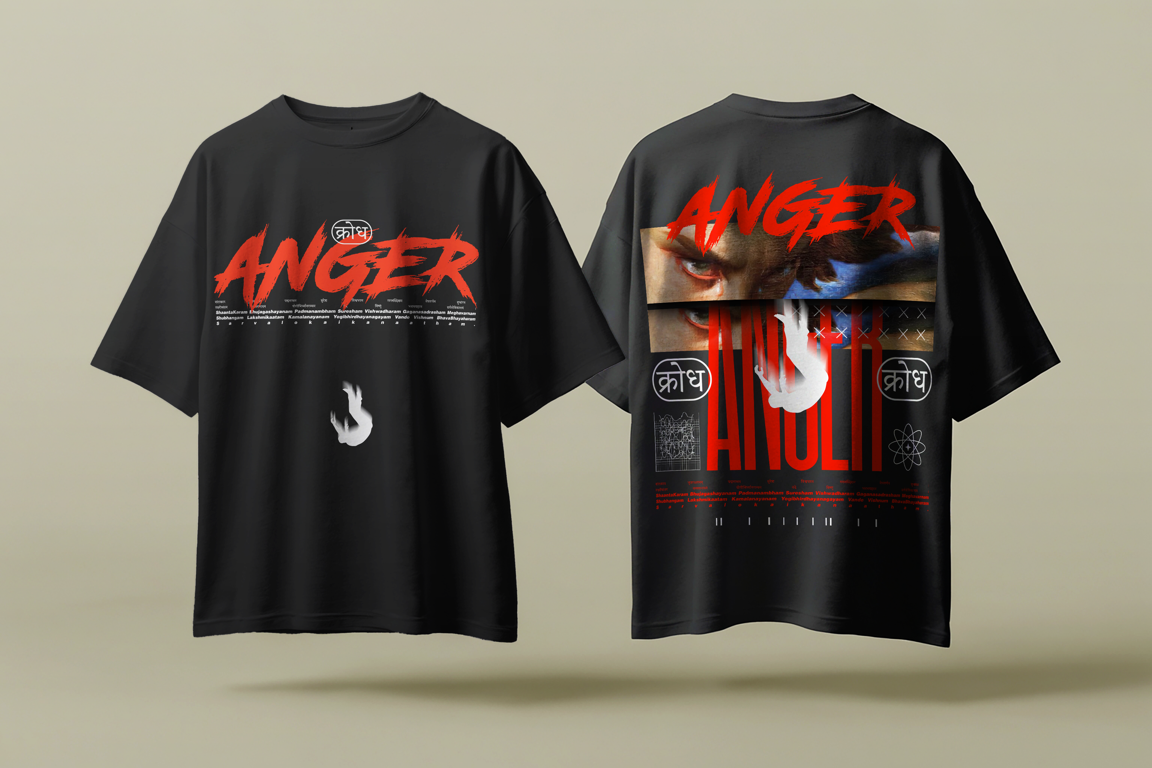A fearless display of raw emotion—this tee explodes with the word “क्रोध” (Krodh) in red and haunting back-art featuring fiery eyes and a falling figure.