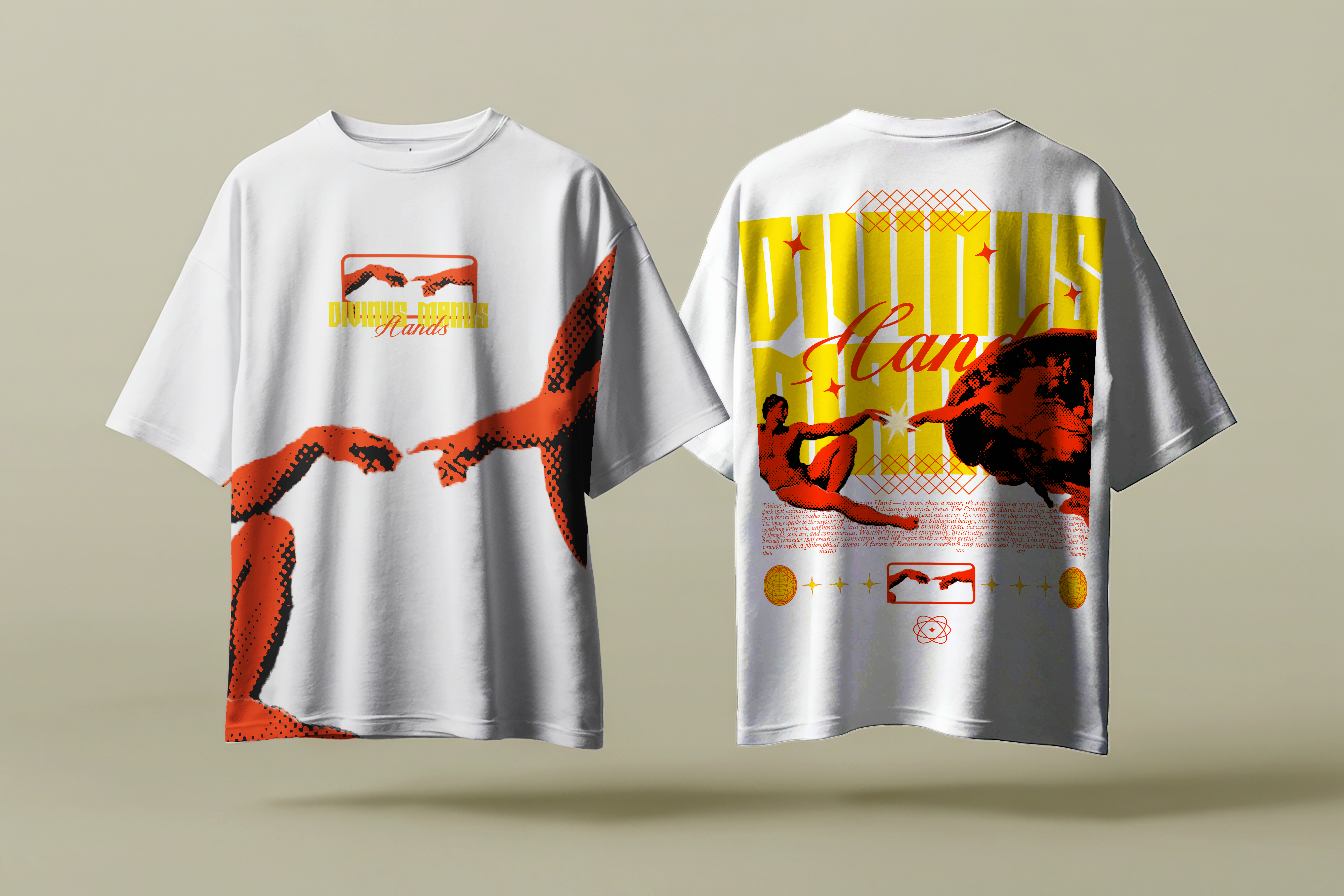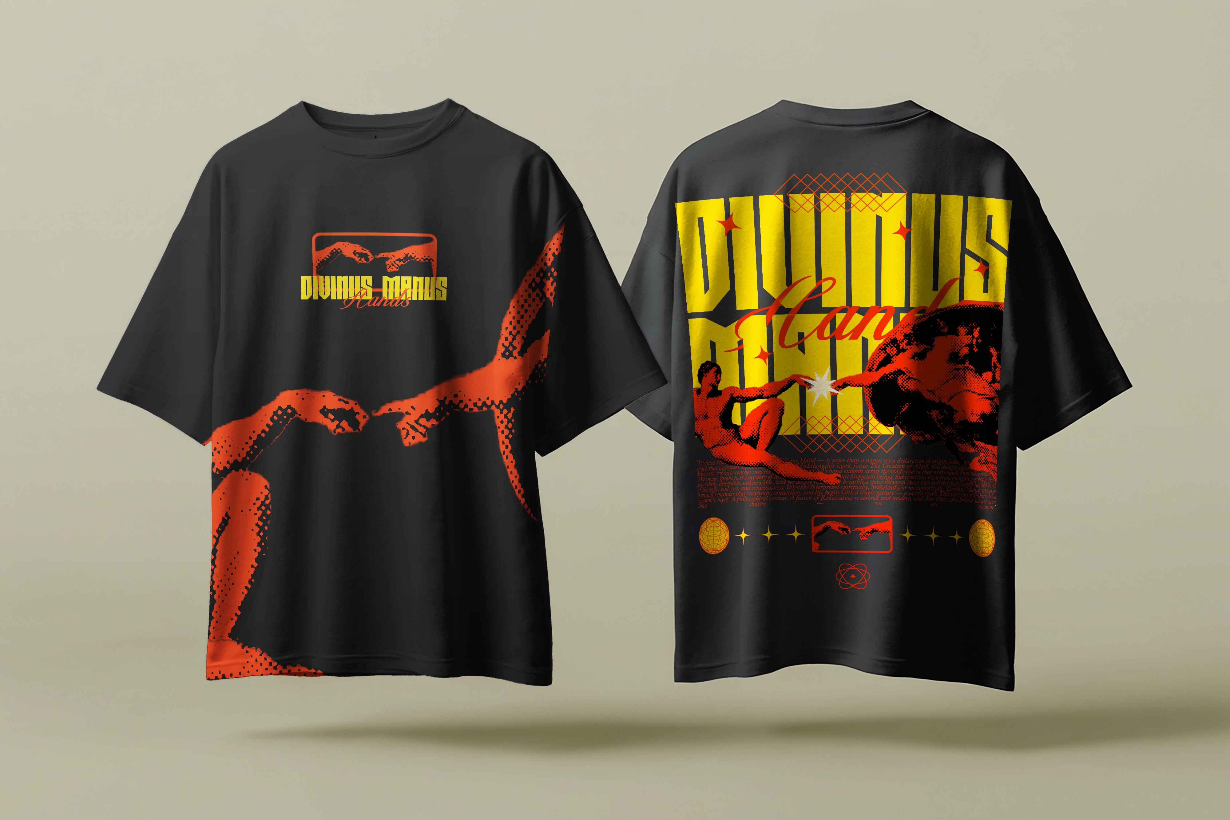 Echoing divine legacy, this black tee features a fiery orange reinterpretation of Michelangelo’s ‘Creation of Adam’ touch. Blending classical art with street cool.