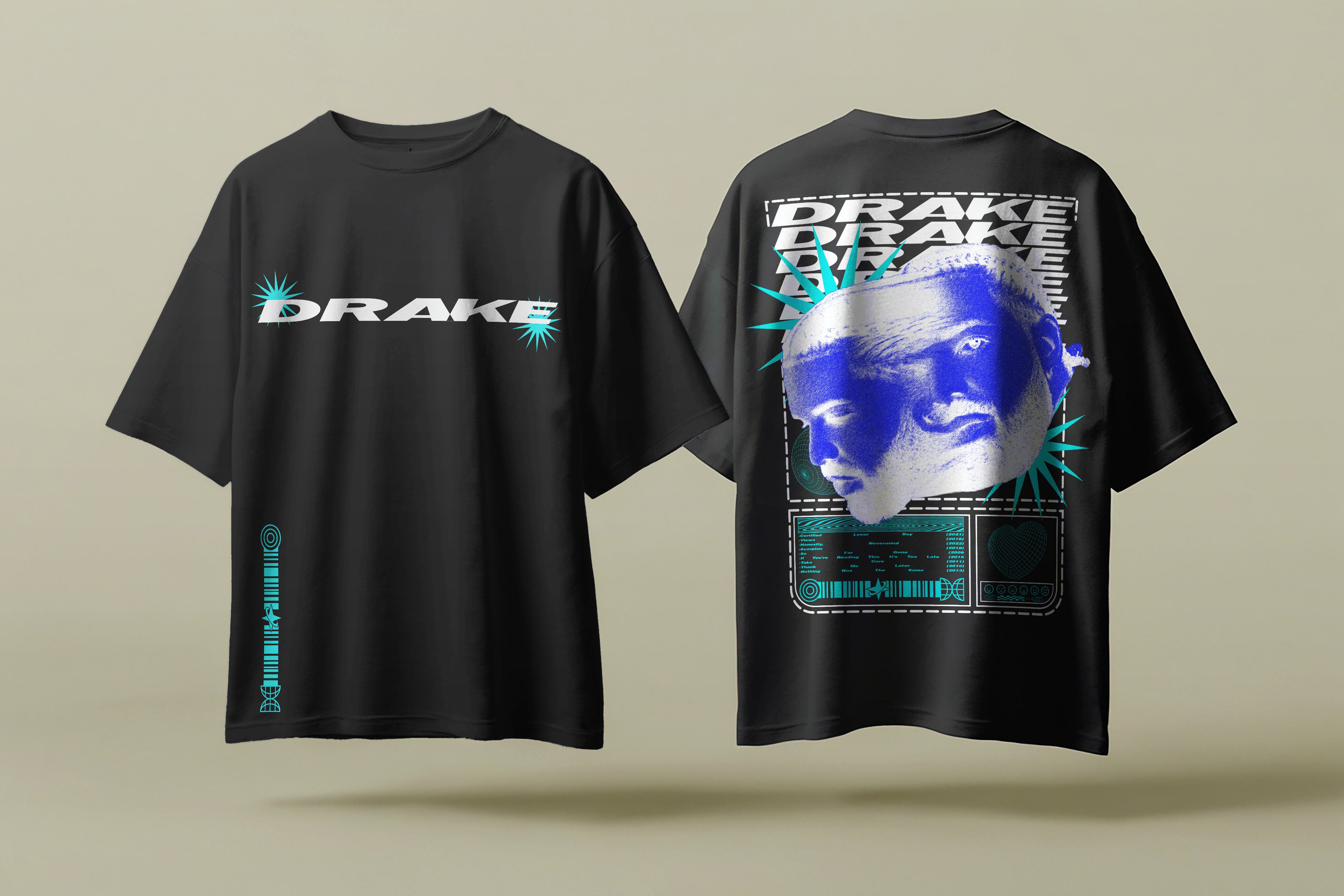 Certified lover boy goes barcode. The front keeps it sleek with laser-etched barcode art, while the back explodes with a dual-tone Drake portrait in vibrant highlighter yellow, surrounded by typographic chaos and encrypted symbols. This is certified street luxury.