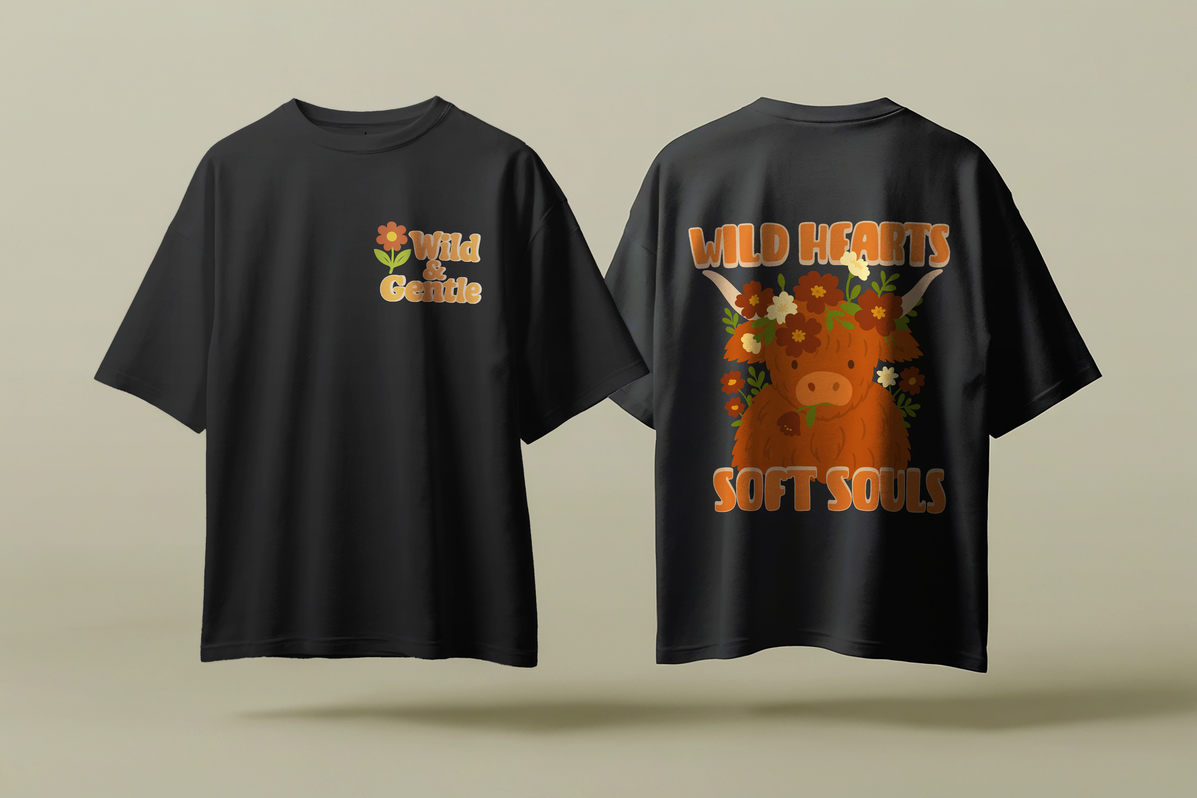 Crafted from ultra-soft premium cotton, this black oversized tee redefines comfort and confidence. The front carries a minimal chest print: Wild Hearts, Soft Souls, while the back boasts a bold, nature-inspired graphic that makes a quiet statement roar.