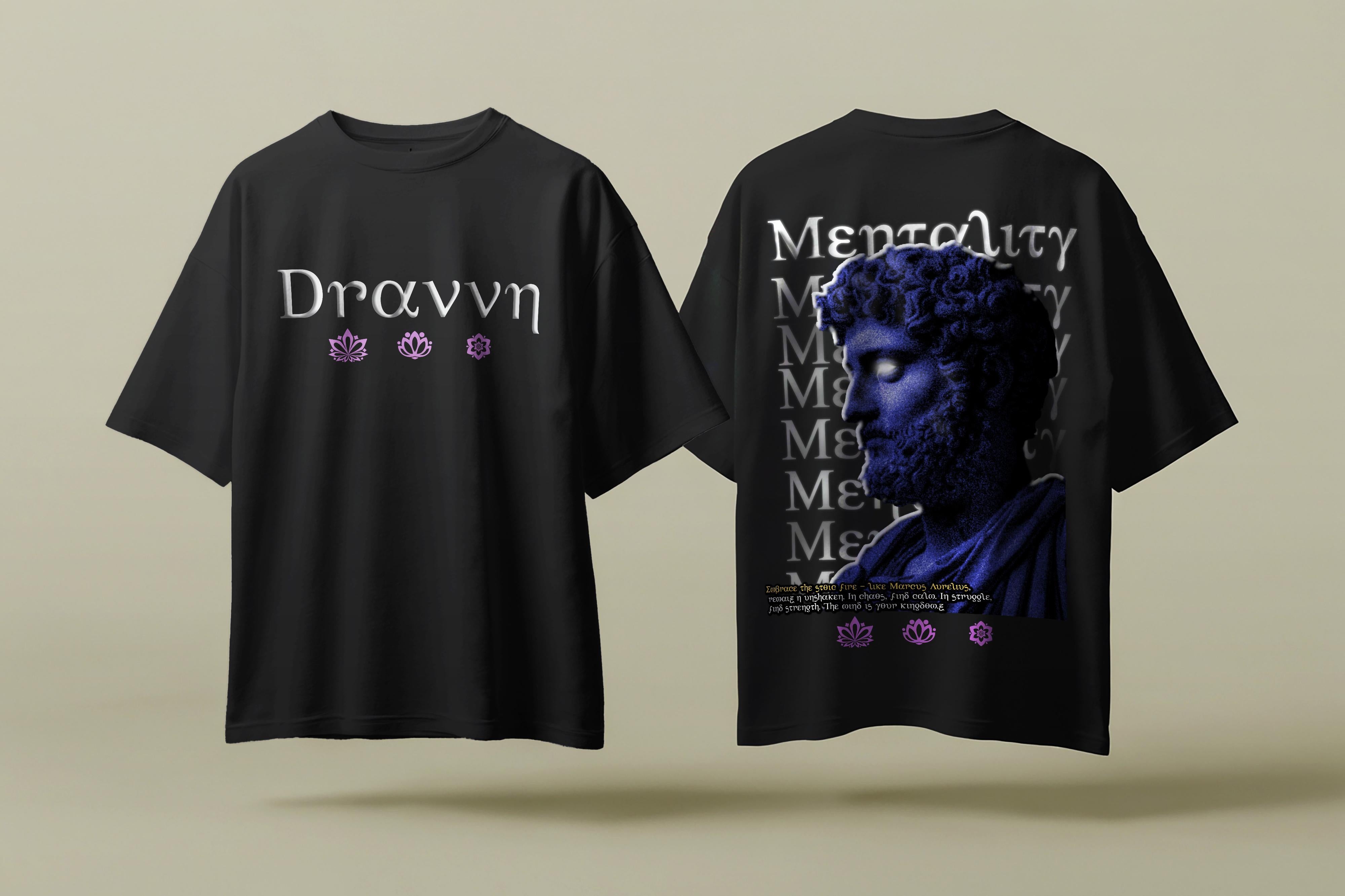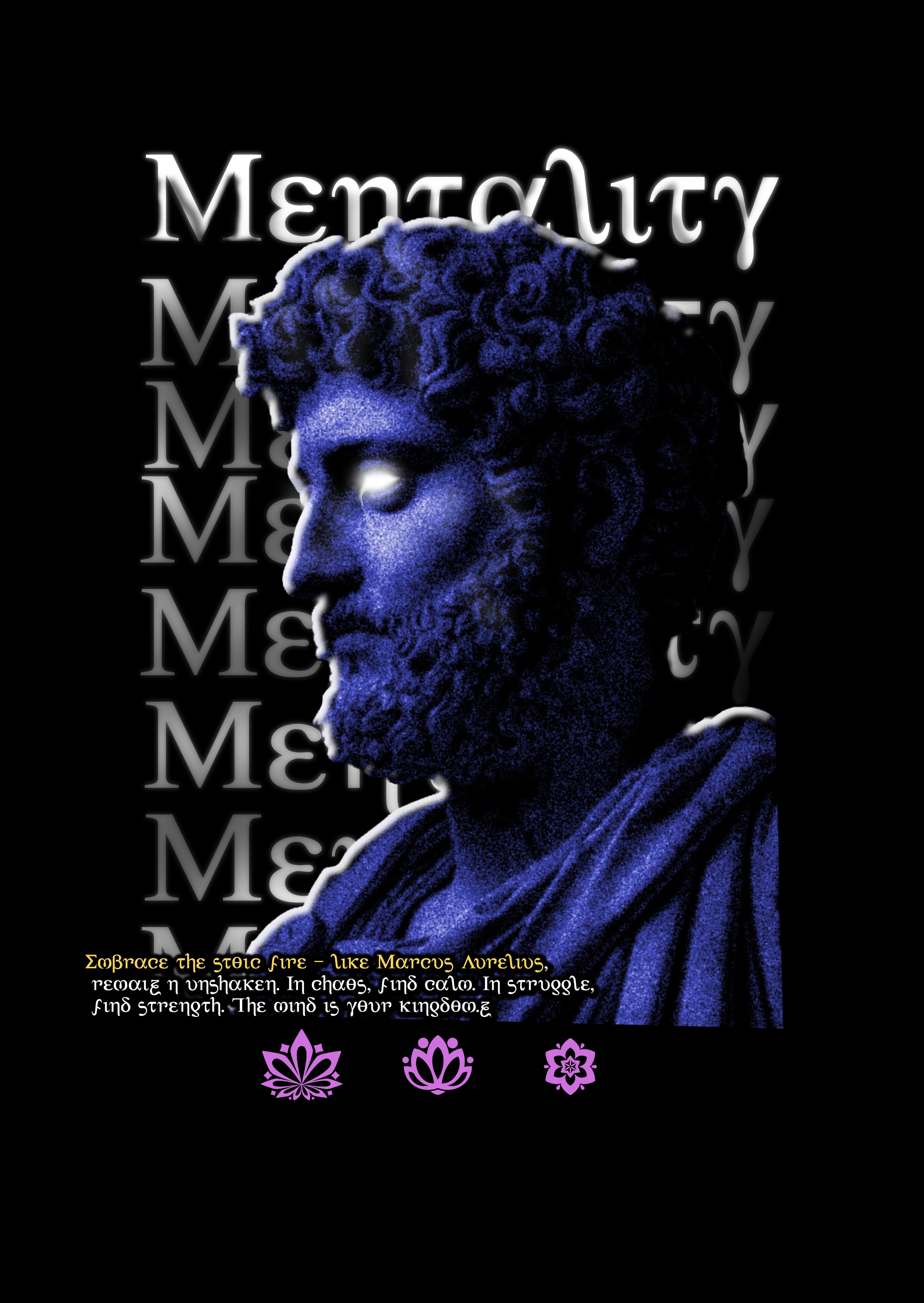 Back Graphic: A glowing bust of Marcus Aurelius in deep blue tones, paired with the word “MENTALITY” above and a profound quote beneath — a wearable compass of stoic philosophy