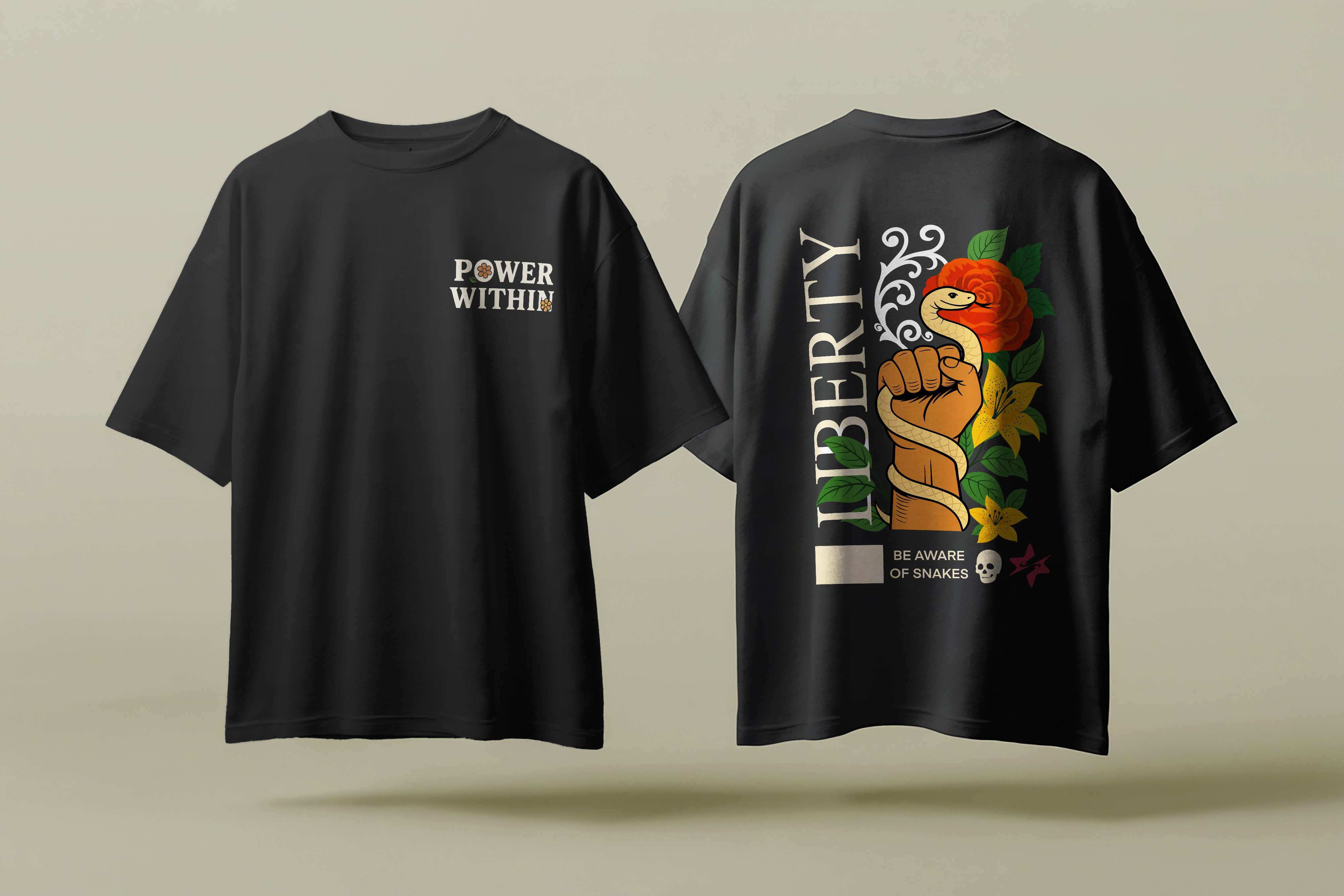 Back Graphic: A powerful raised fist entwined with floral vines and a serpent, surrounded by the words “LIBERTY” and “THE STRUGGLE OF SHARES” — a symbolic fusion of defiance, growth, and liberation