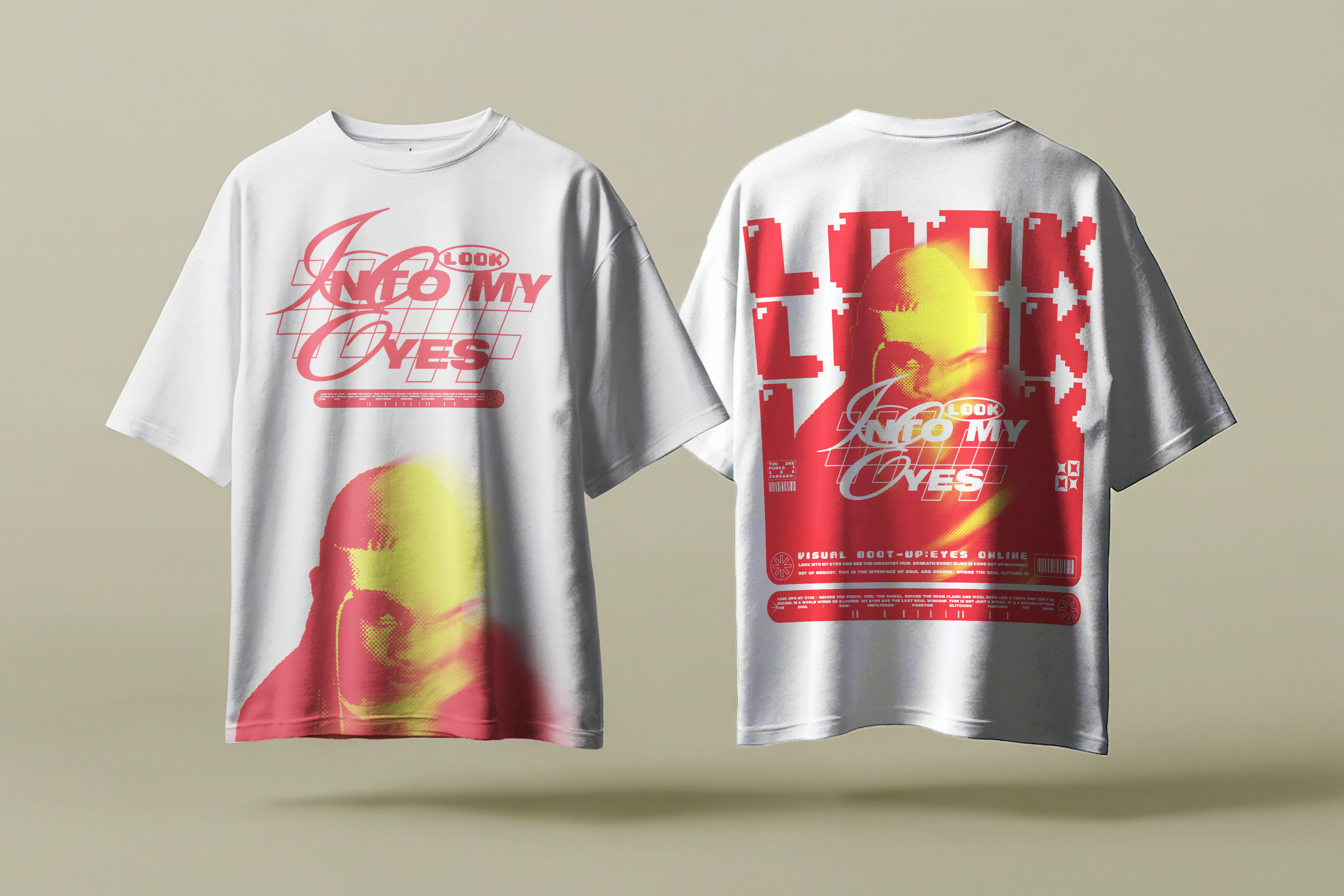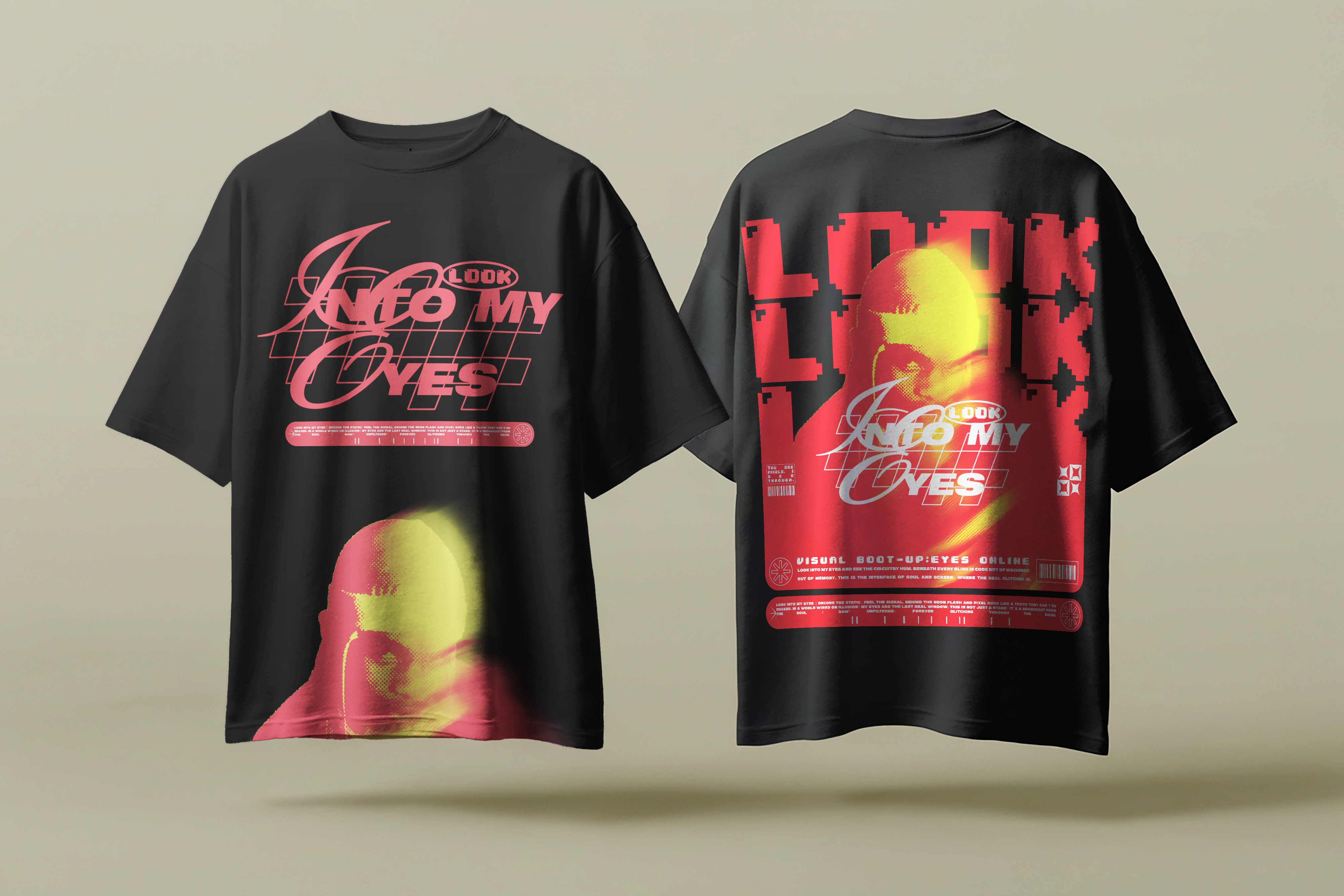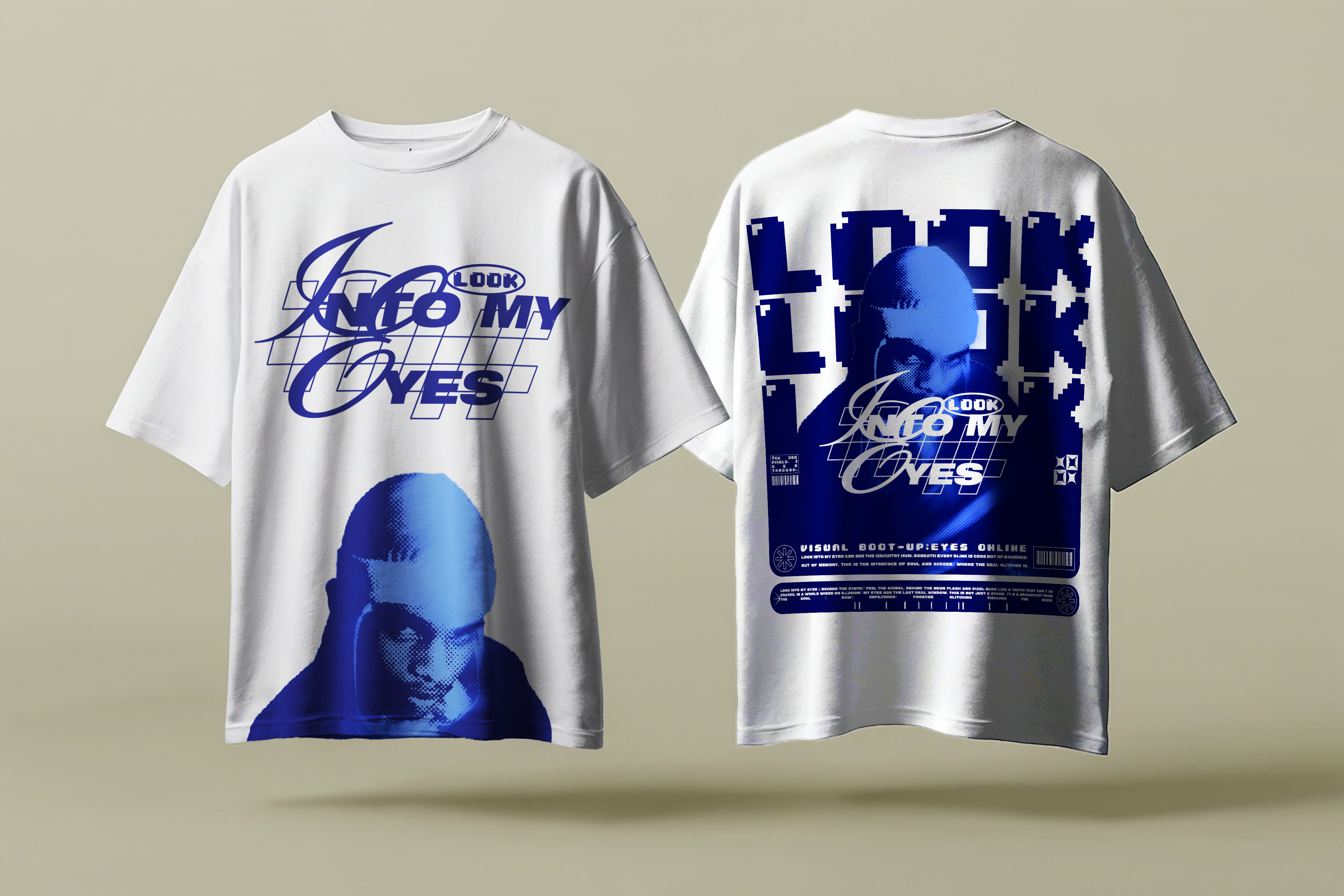 Step into a neo-futuristic dreamscape with the “Into My Eyes” tee. This cyberpunk-inspired design features a stylized electric blue portrait with glitch-text effects and retro grid overlays. The intense stare and warped typography scream tech-rebellion, perfect for late-night city walks or anime-core aesthetics.