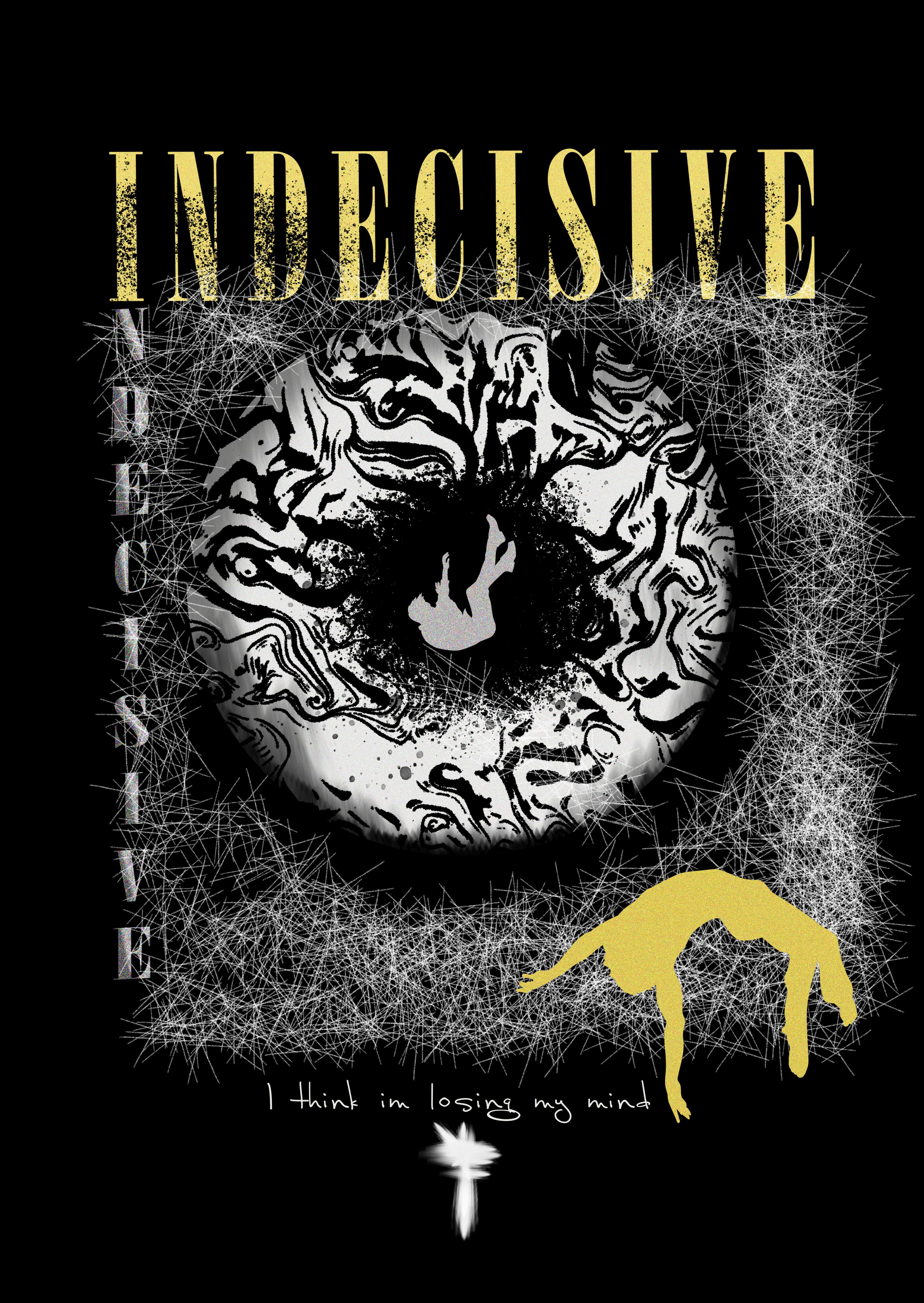Back Artwork: The word “INDECISIVE” sits atop a swirling abyss, where a lone figure falls inward. Layered with distressed patterns, abstract detailing, and a soft golden accent, the visual is completed with the haunting phrase: