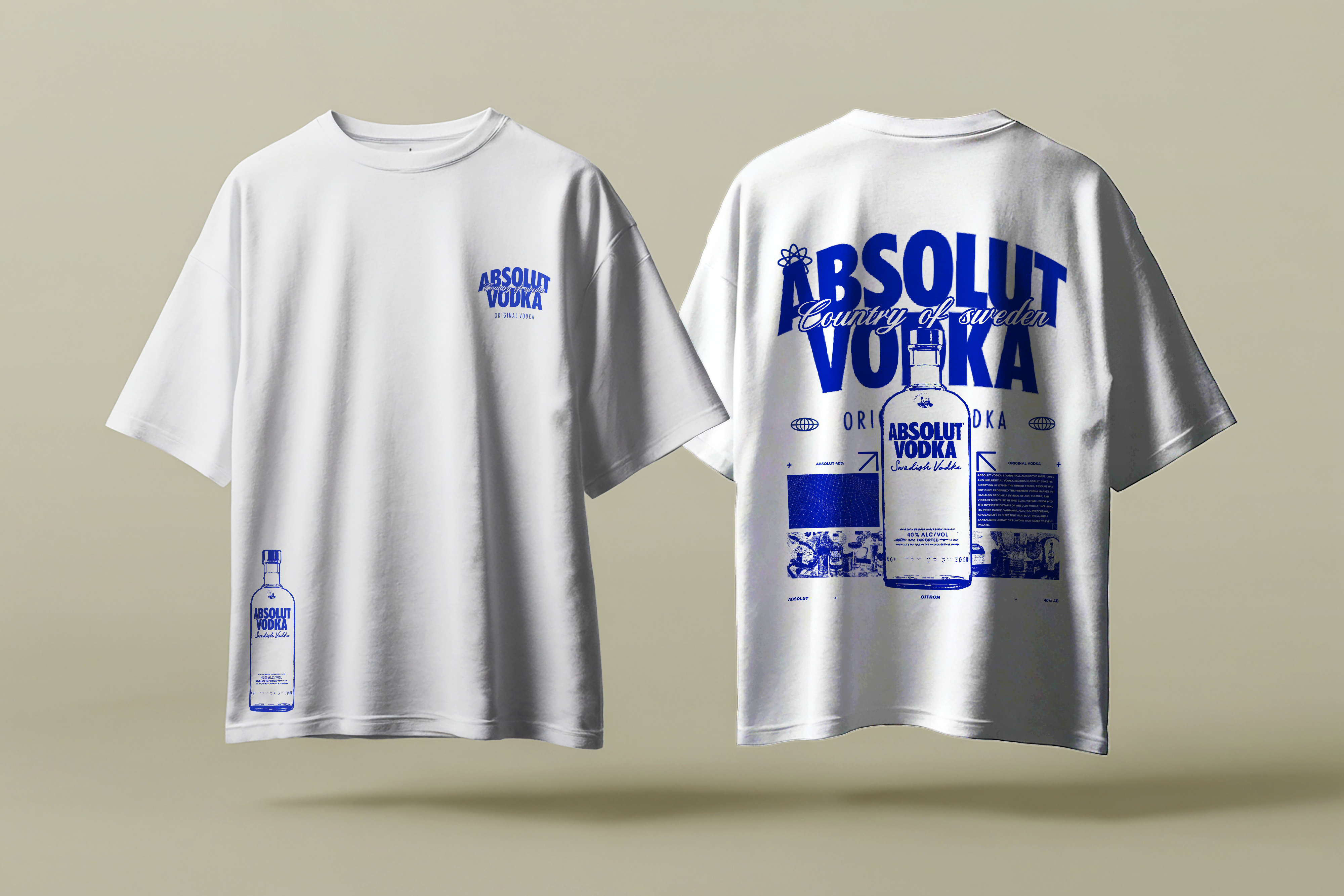 Channel the crisp, cool aesthetic of Scandinavian nightlife with this white streetwear tee featuring a bold Absolut Bleu logo. Subtle front-pocket branding and a full-back graphic make this shirt perfect for night drives, house parties, or upscale lounges.