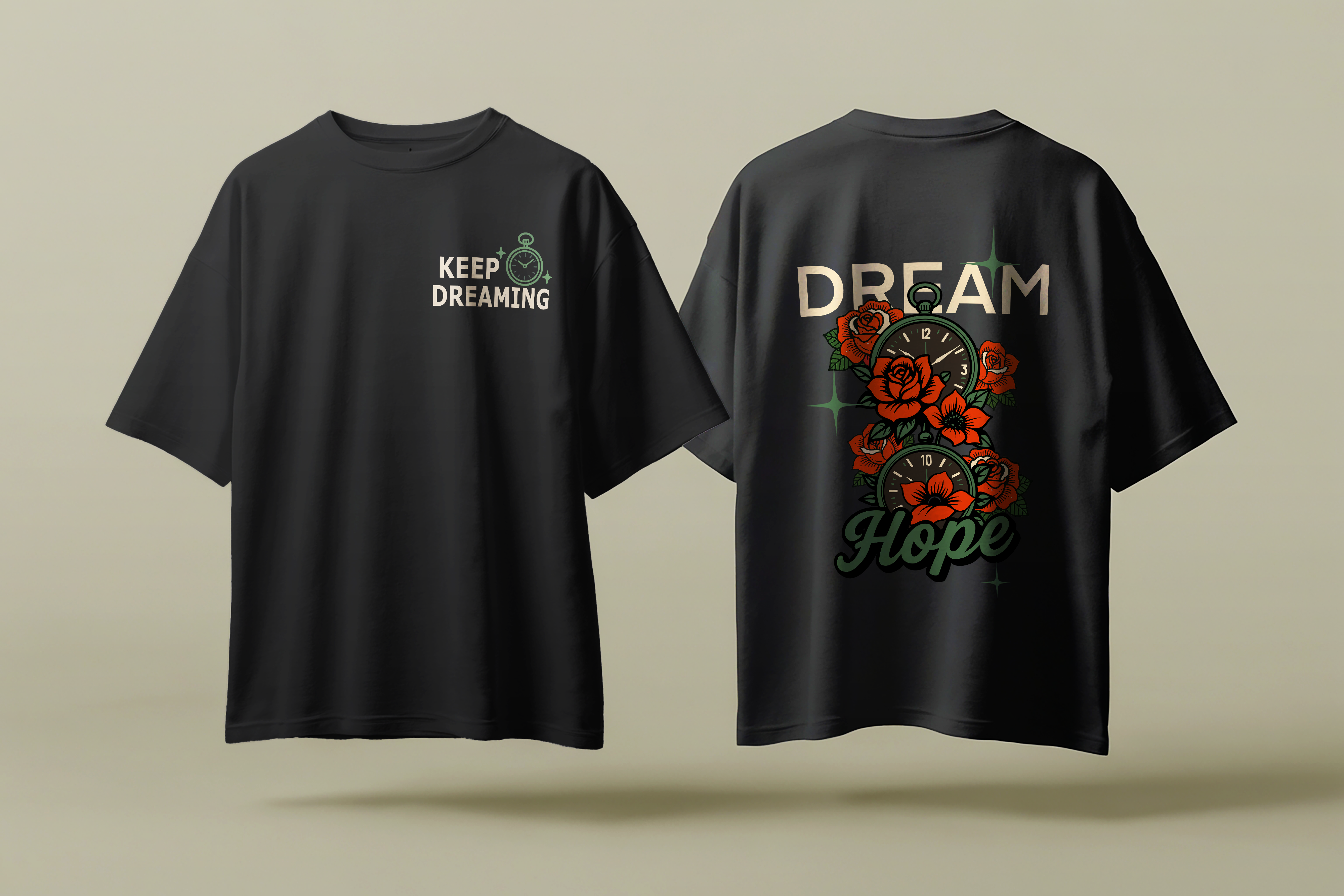 The front features a minimalist “KEEP DREAMING” print — a gentle push to never stop believing. On the back, vibrant roses bloom around the bold words “DREAM” and “HOPE,” creating an artistic reminder to stay inspired, no matter where life takes you.