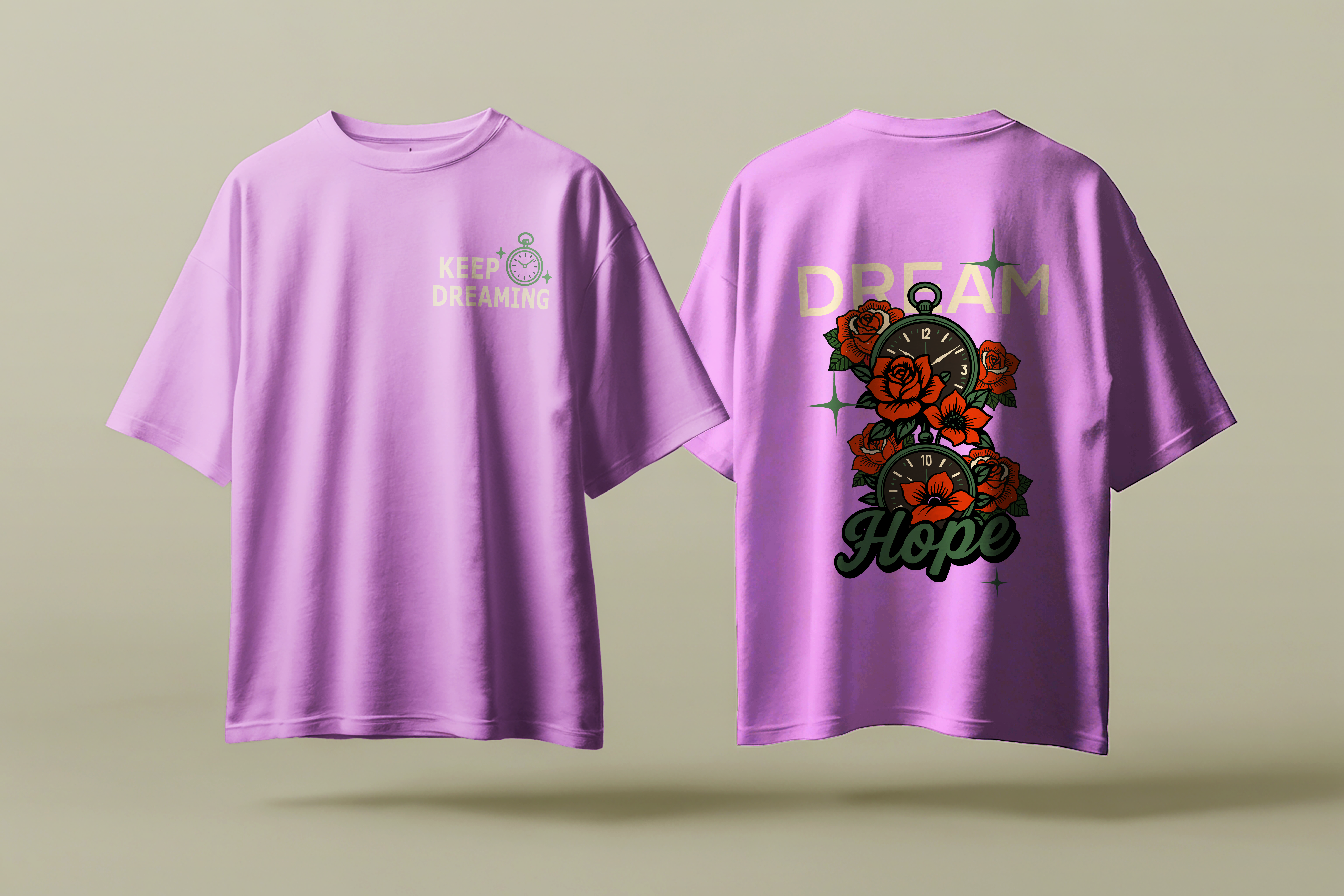Wrap yourself in calm confidence with the Dream & Hope Oversized Tee in a soothing lavender hue. Designed for those who believe in the power of positivity, this tee blends comfort, color, and meaning into your everyday style.
